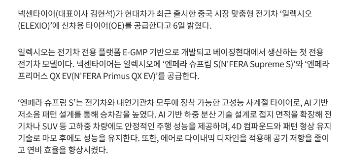 넥센타이어, 현대차 중국 전략형 전기 SUV 일렉시오에 OE 공급