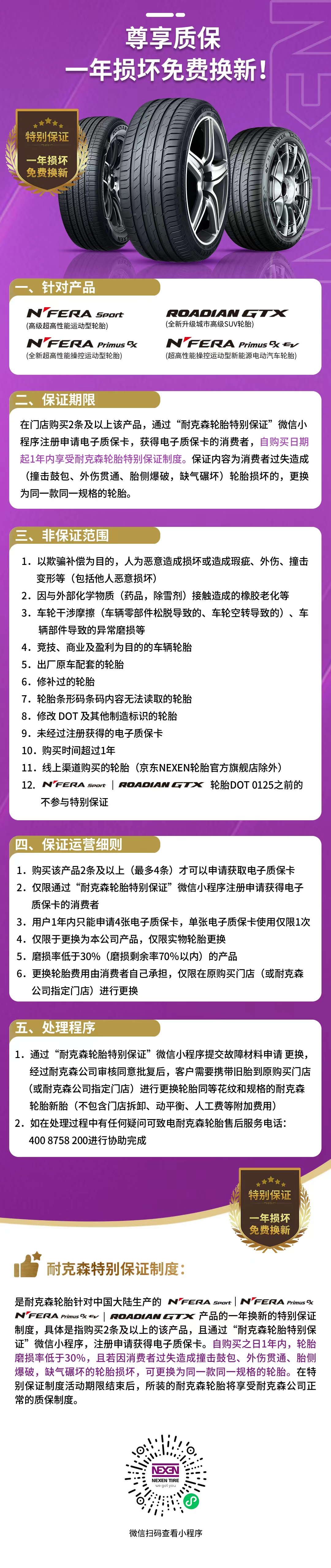 耐克森轮胎特别保证小程序已上线,请广大用户查阅海报了解政策详情。 同时,您可以通过: 1.微信搜索【耐克森轮胎特别保证】小程序直接登录; 2.微信关注【耐克森轮胎】官方账号,通过官方账号菜单栏的【互动专区】-【特别保证】栏目登录;