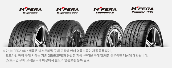 名作 엔페라 新 명품보증제도 2025, 2026년 매장에서 N’FERA Supreme, N’FERA Supreme SUV, N’FERA Supreme S, N’FERA Primus AS T1 제품을 구매하고 1개월 이내 고객정보 및 서비스 이용 동의 완료한 고객에 한해 구매일로부터 1년간 엔페라 新 명품보증제도 혜택을 드립니다.